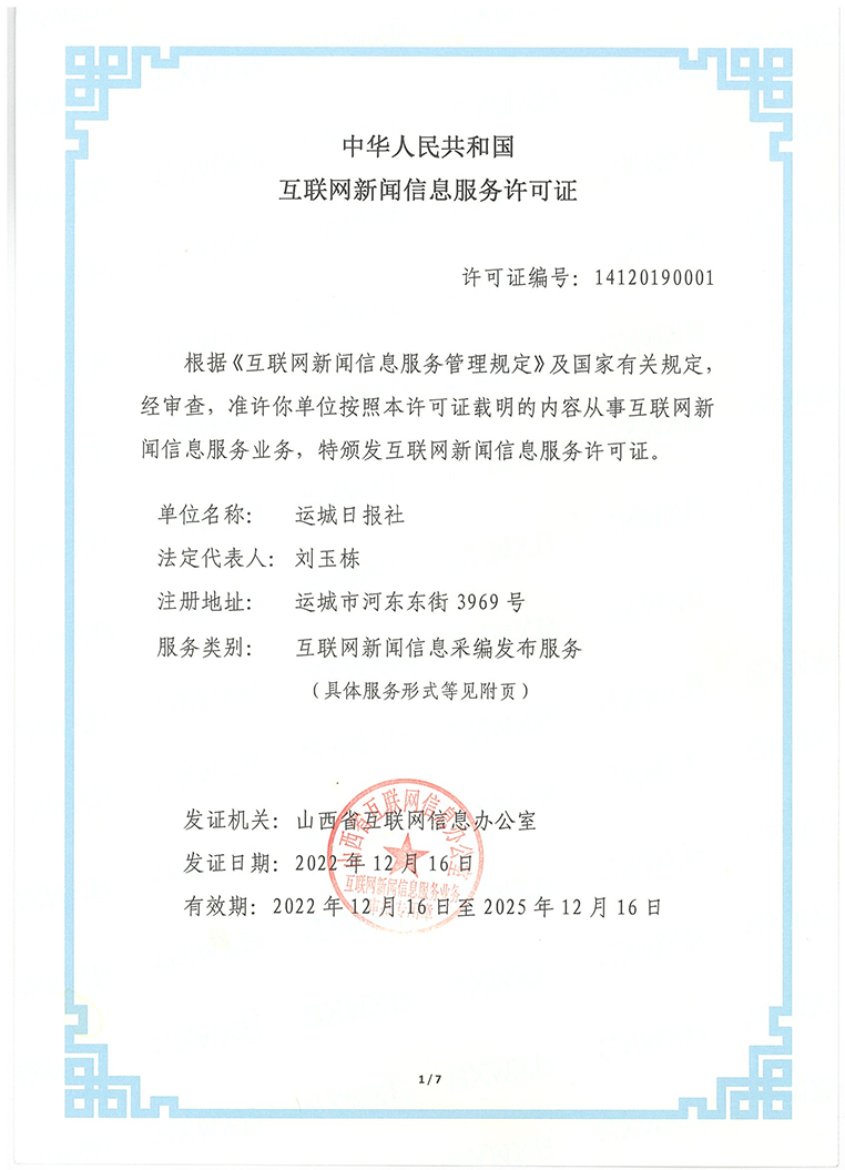 運(yùn)城日?qǐng)?bào)、運(yùn)城晚報(bào)所有自采新聞(含圖片)獨(dú)家授權(quán)運(yùn)城新聞網(wǎng)發(fā)布,未經(jīng)允許不得轉(zhuǎn)載或鏡像;授權(quán)轉(zhuǎn)載務(wù)必注明來(lái)源,例:“運(yùn)城新聞網(wǎng)-運(yùn)城日?qǐng)?bào) ”。